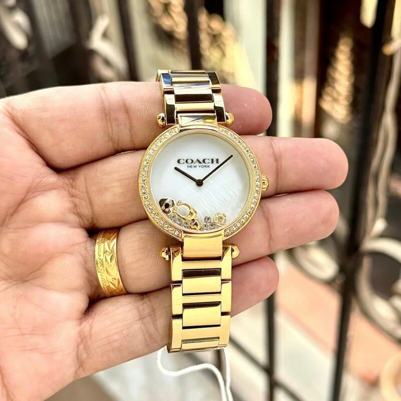 • Elegant White Mother-of-Pearl Dial with Floating COACH Logo & Heart Charms